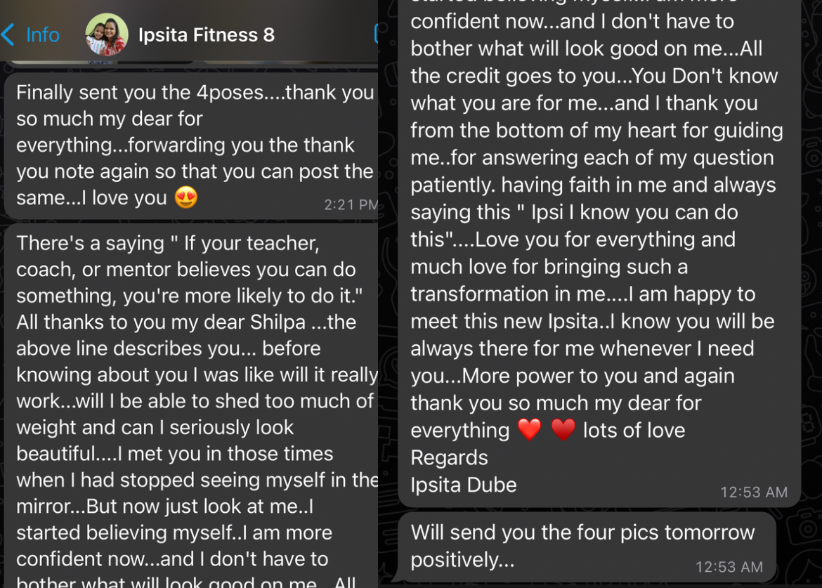 Until she was introduced to GET FIT WITH SHILPI through her cousin,my previous client ( Dr. Upasana Dube).